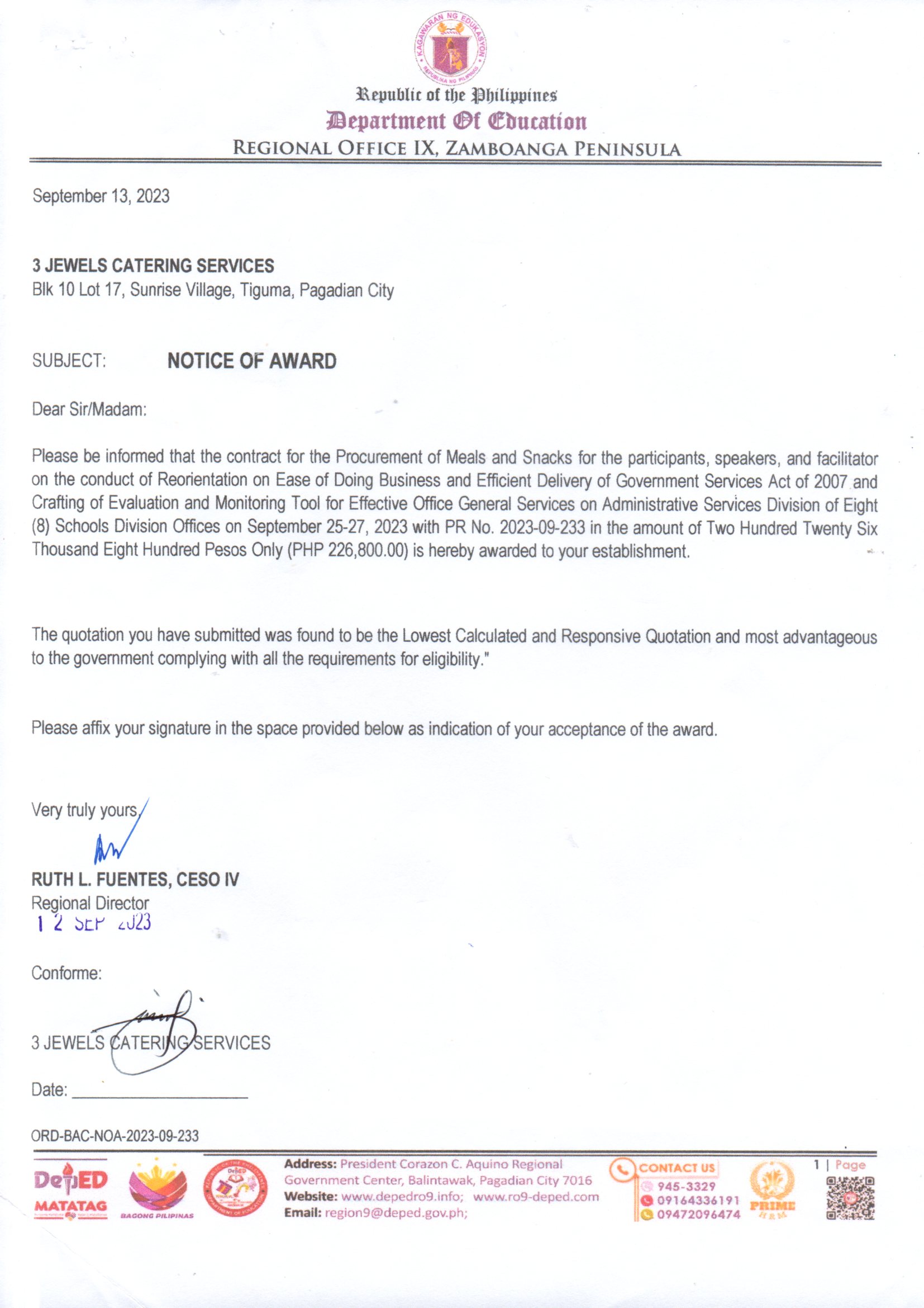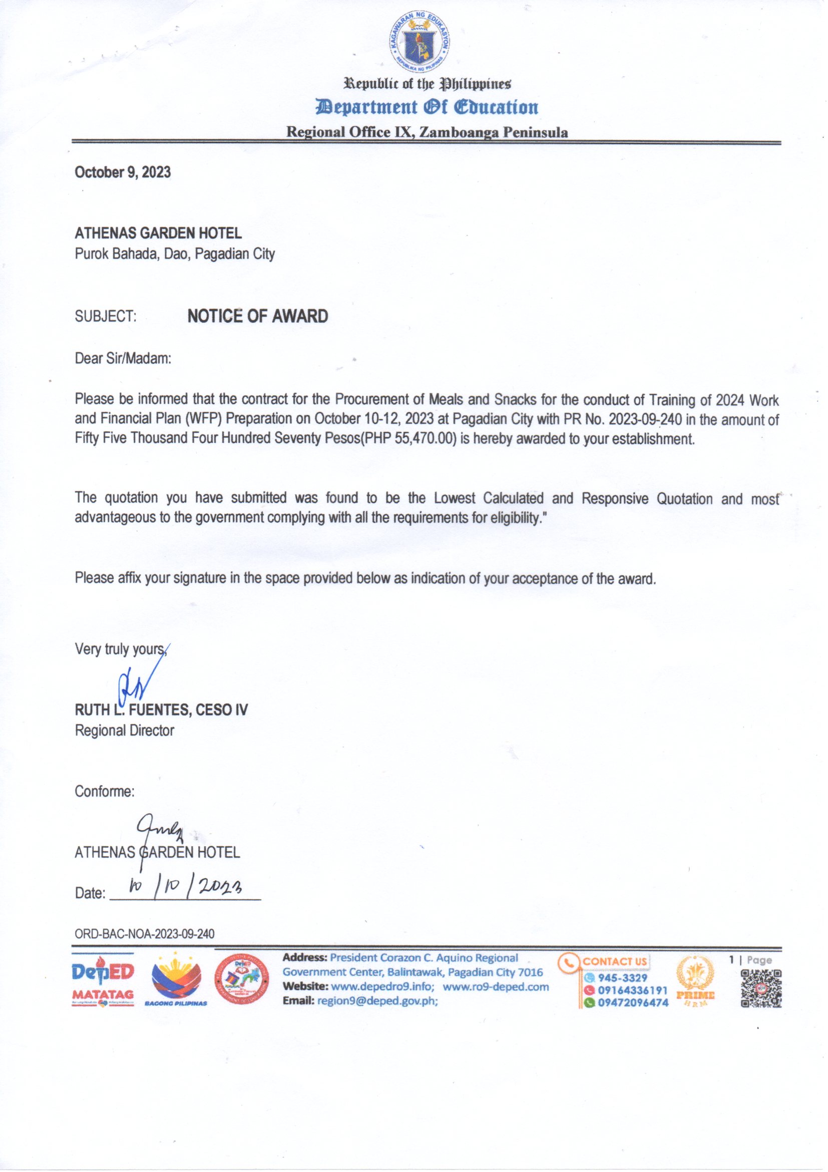 Procurement of Meals and Snacks for the conduct of Training of 2024 Work and Financial Plan (WFP) Preparation on October 10-12, 2023 at Pagadian City