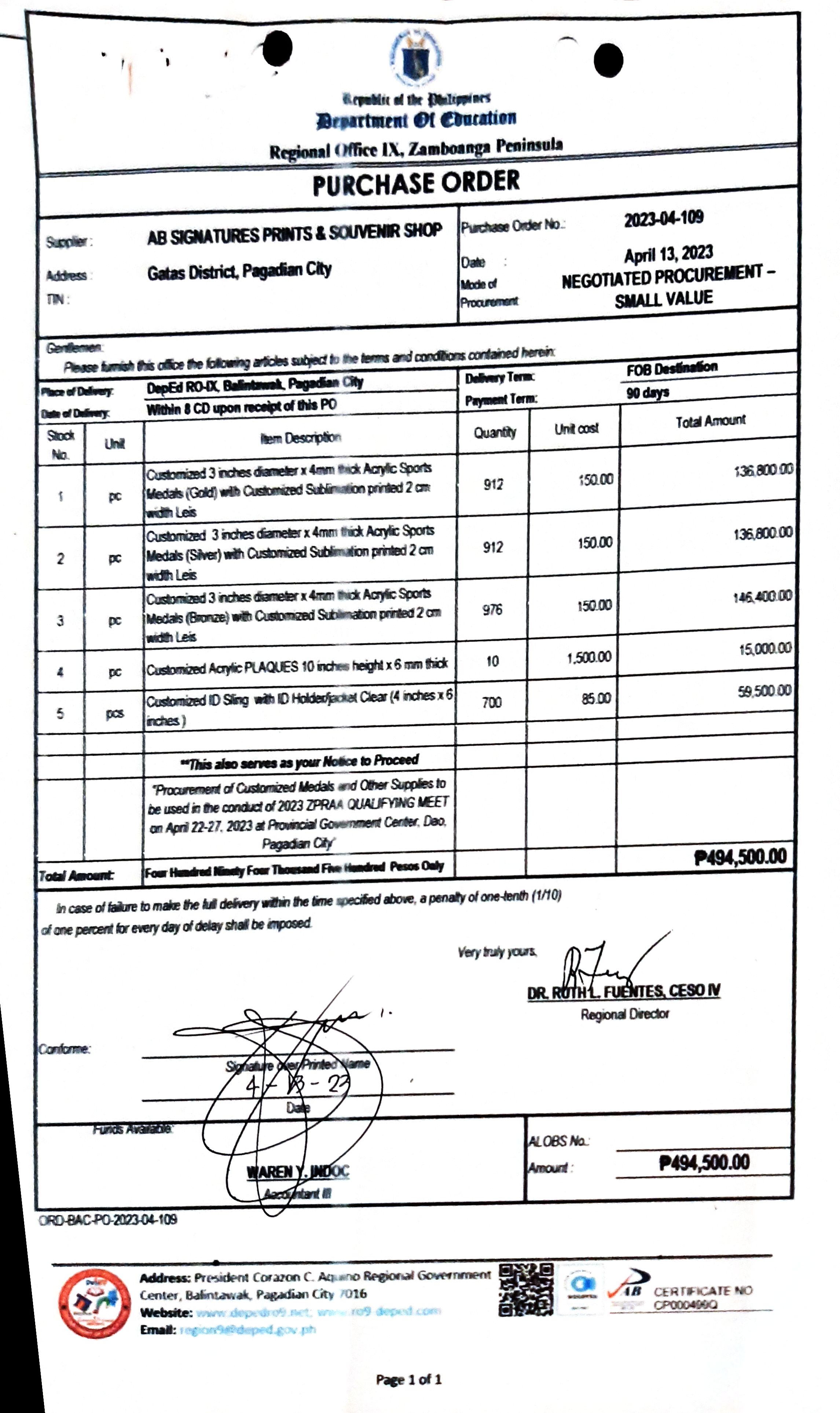 Procurement of Customized Medals and Other Supplies to be used in the conduct of 2023 ZPRAA QUALIFYING MEET on April 22-27, 2023 at Provincial Government Center, Dao, Pagadian City
