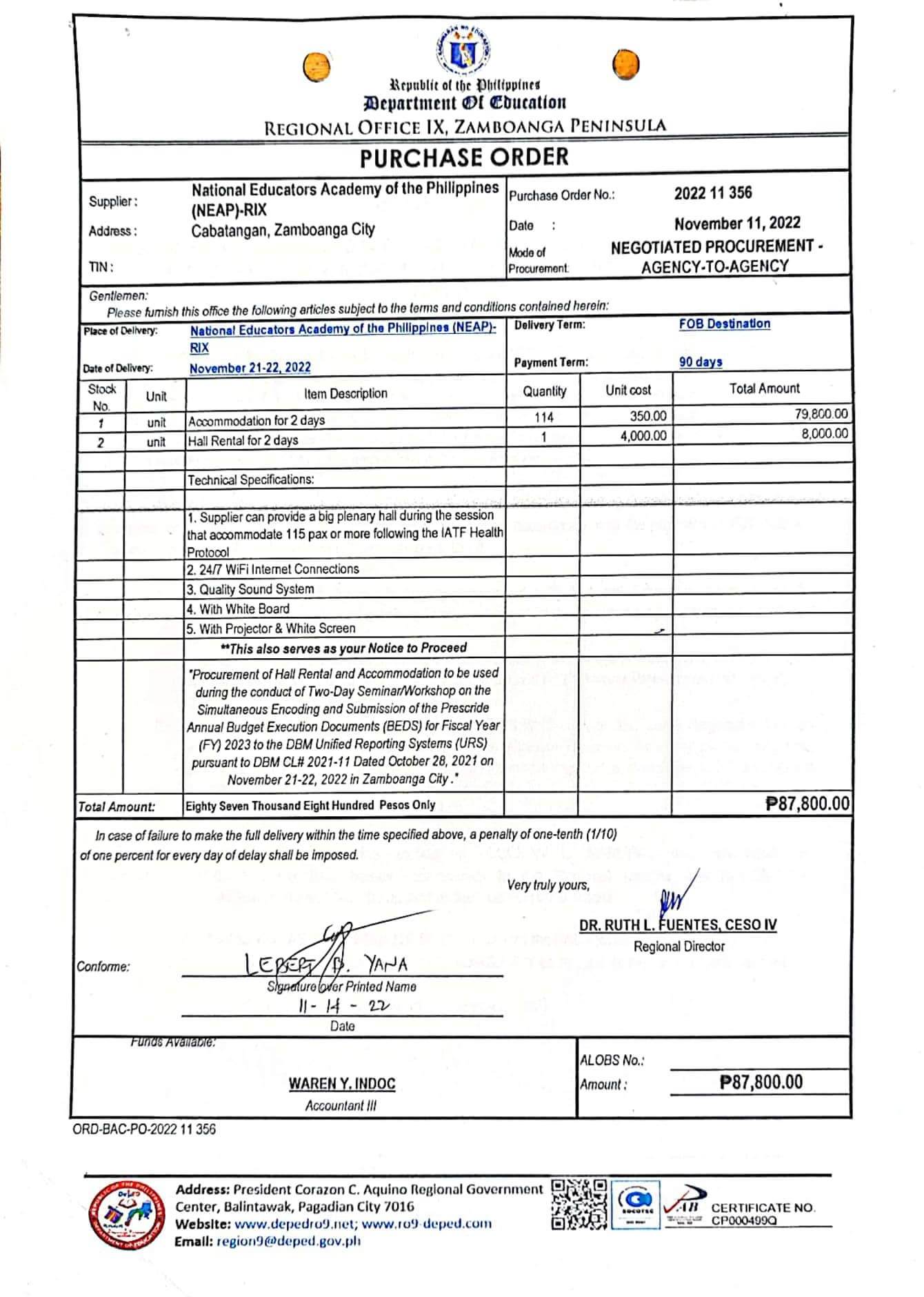 Procurement of Hall Rental and Accommodation to be used during the conduct of Two-Day Seminar/Workshop on the Simultaneous Encoding and Submission of the Prescribe Annual Budget Execution Documents (BEDS) for Fiscal Year (FY) 2023 to the DBM Unified Reporting Systems (URS) pursuant to DBM CL# 2021-11 Dated October 28, 2021 on November 21-22, 2022 in Zambanga City.