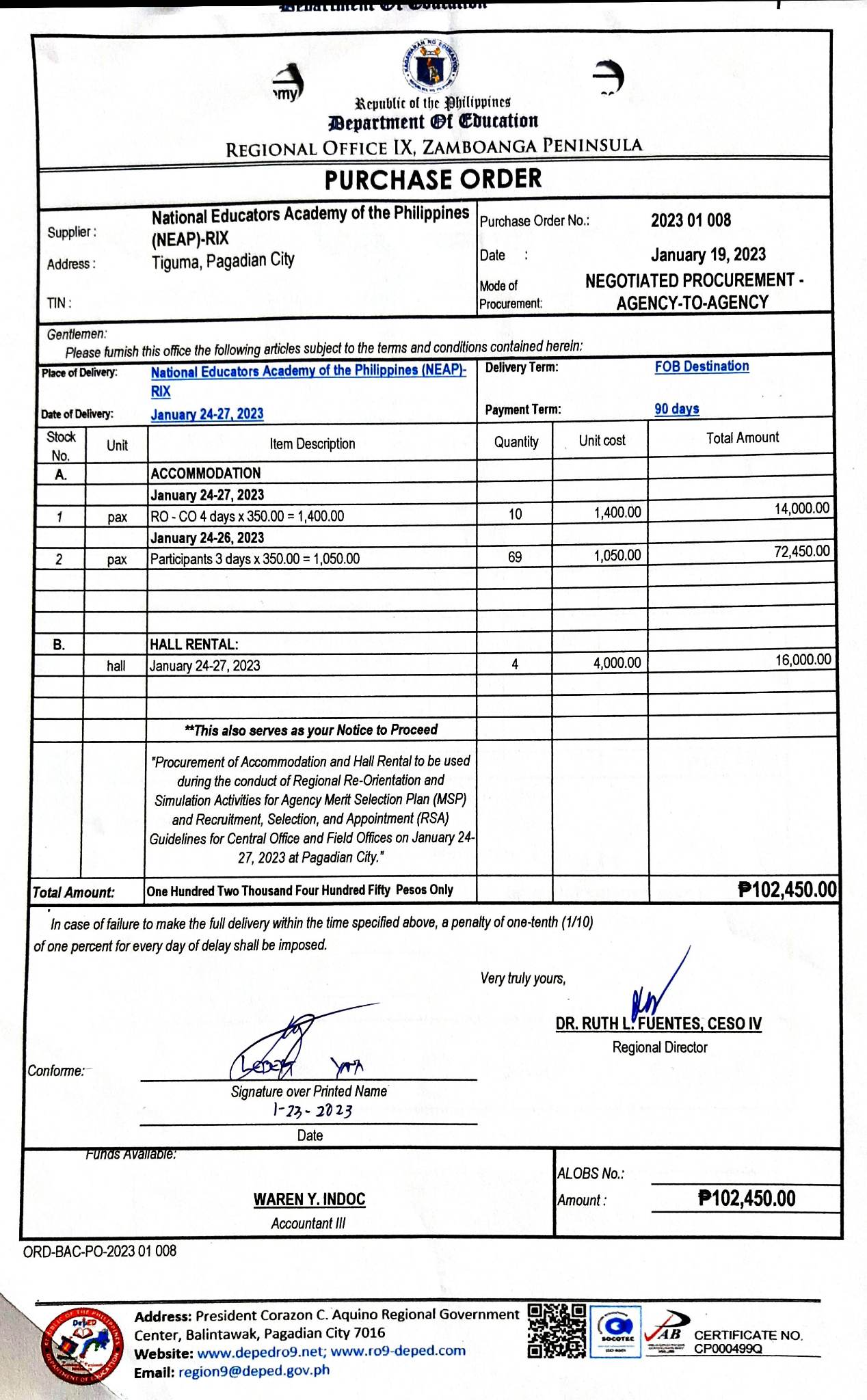 Procurement of Food to be served during the conduct of Regional Re- Orientation and Simulation Activities for Agency Merit Selection Plan (MSP) and Recruitment, Selection, and Appointment (RSA) Guidelines for Central Office and Field Offices on January 24-27, 2023 at NEAP R-IX, Tiguma, Pagadian City