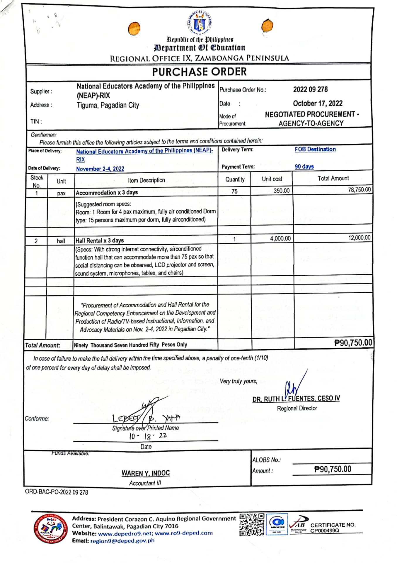 Procurement of Accommodation and Hall Rental to be used during the conduct of for the Regional Competency Enhancement on the Development and Production of Radio/TV-based Instructional, Information, and Advocacy Materials on Nov. 2-4, 2022 in Pagadian City.