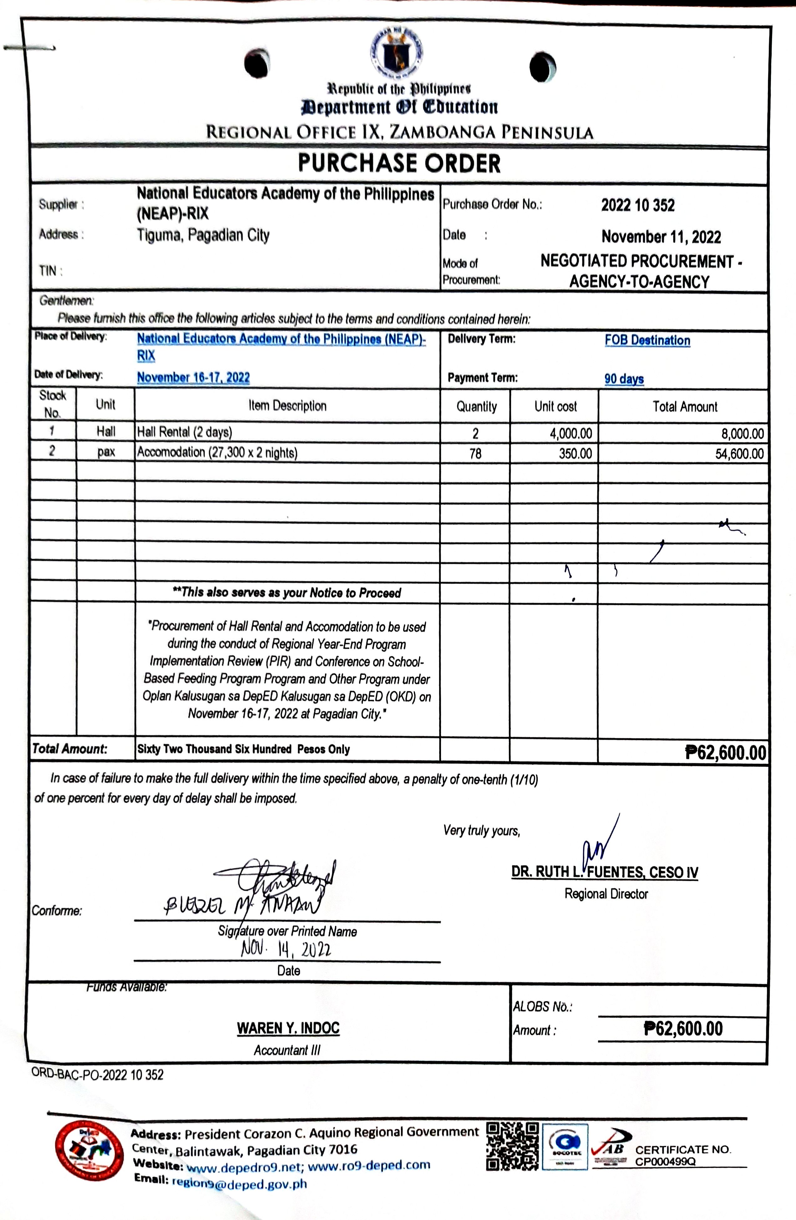 Food for the conduct of 2022 Year -End Performance Implementation Review and 2023 Pre-Planning Conference of NEAP R-IX on November 24-26, 2022 at NEAP R-IX, Tiguma, Pagadian City.