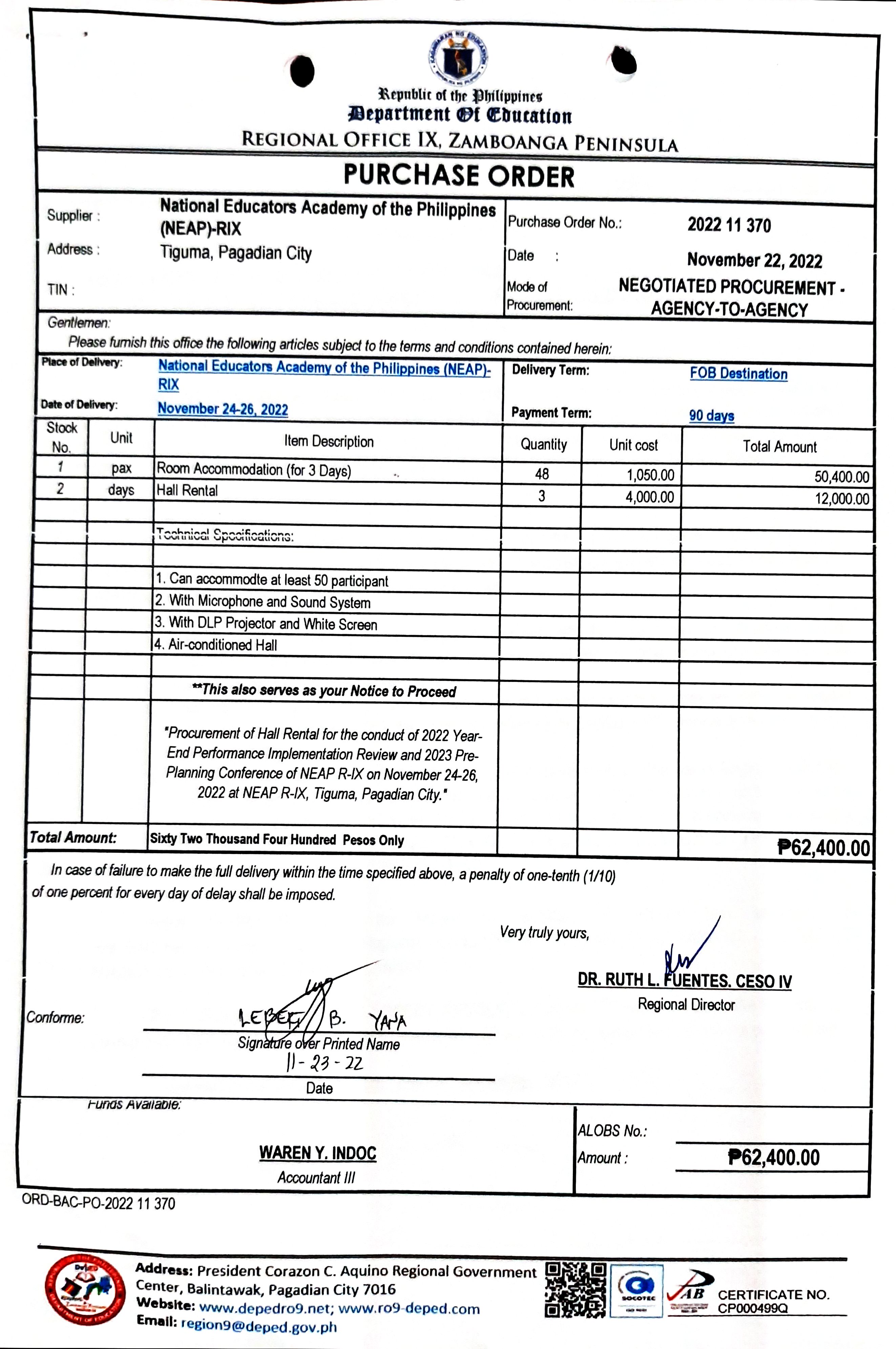 Procurement of Hall Rental for the conduct of 2022 Year-End Performance Implementation Review and 2023 Pre-Planning Conference of NEAP R-IX on November 24-26, 2022 at NEAP R-IX, Tiguma, Pagadian City