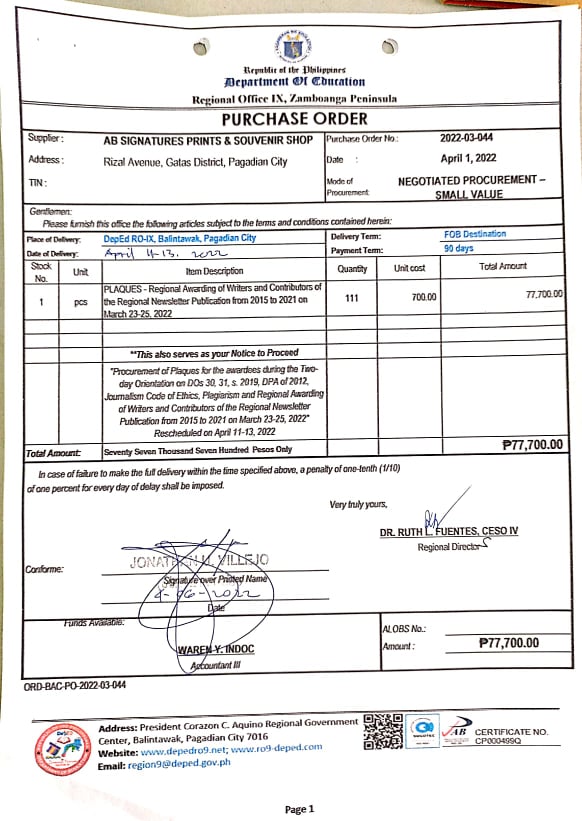 Procurement of Plaques for the awardees during the Two-day Orientation on DOs 30, 31, s. 2019, DPA of 2012, Journalism Code of Ethics, Plagiarism and Regional Awarding of Writers and Contributors of the Regional Newsletter Publication from 2015 to 2021 on March 23-25, 2022" Rescheduled on April 11-13, 2022